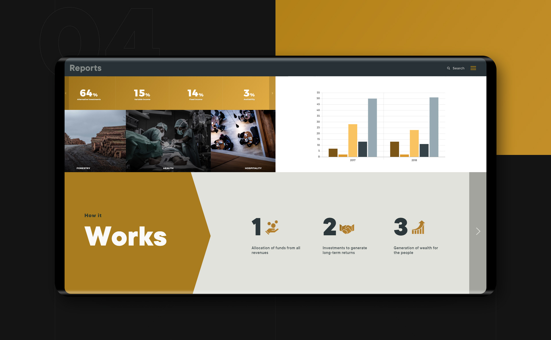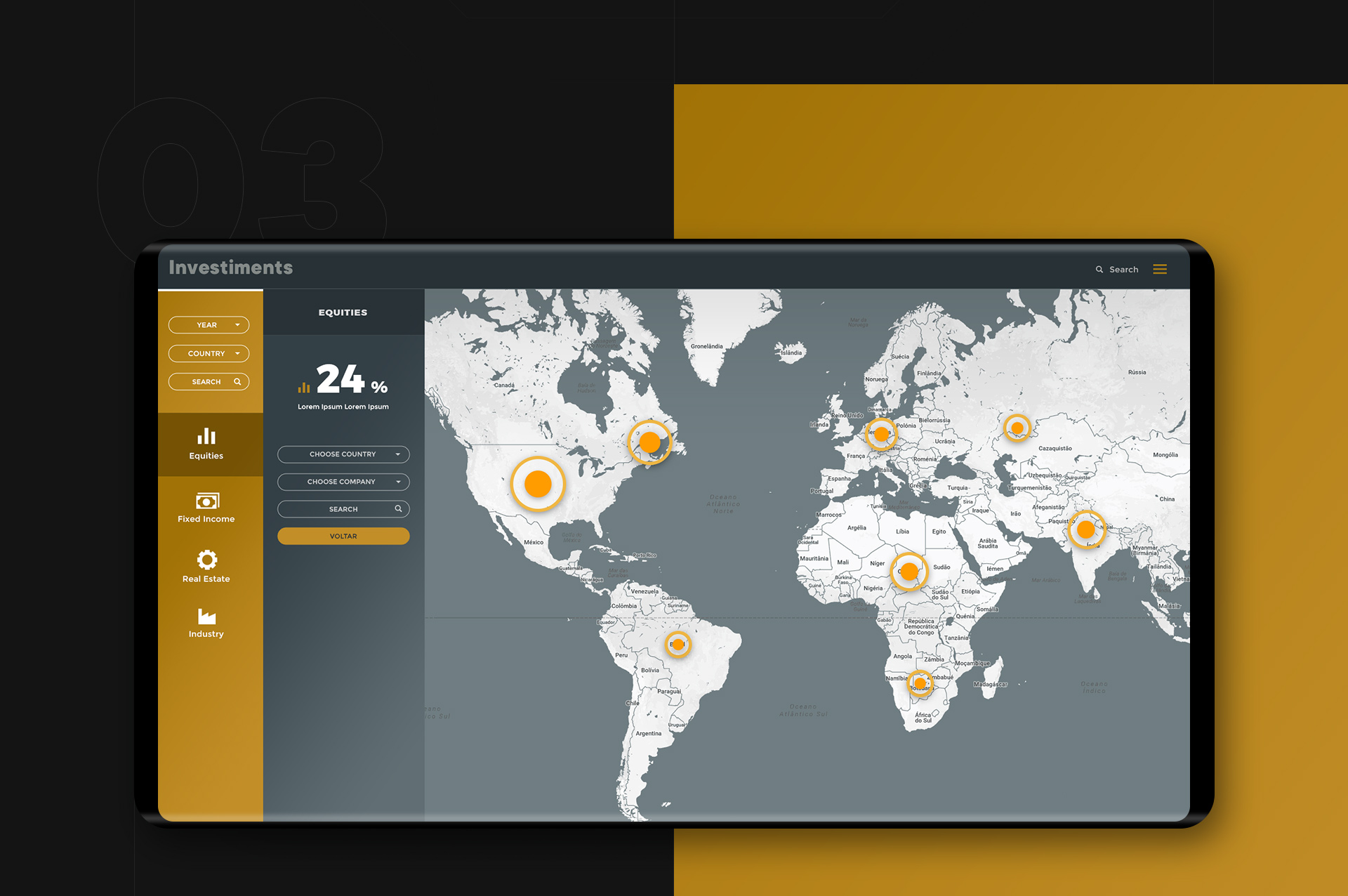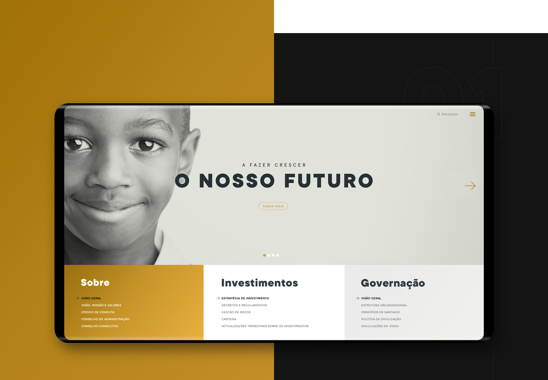 Design de website para Fundo de Investimento. Esta plataforma digital pretende comunicar de forma detalhada toda a carteira de investimentos e assegurar uma visualização clara e transparente de todos os mecanismos de análise.