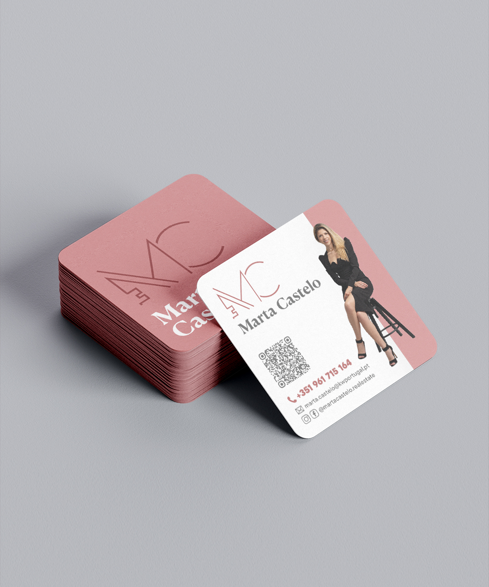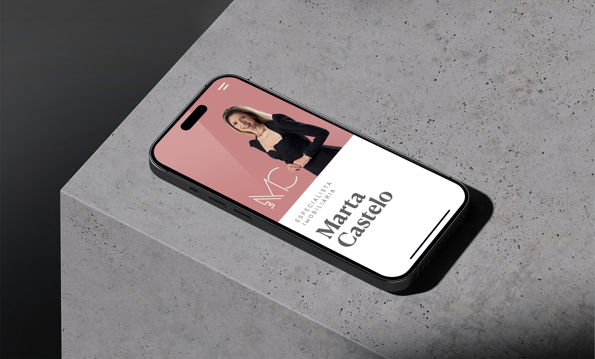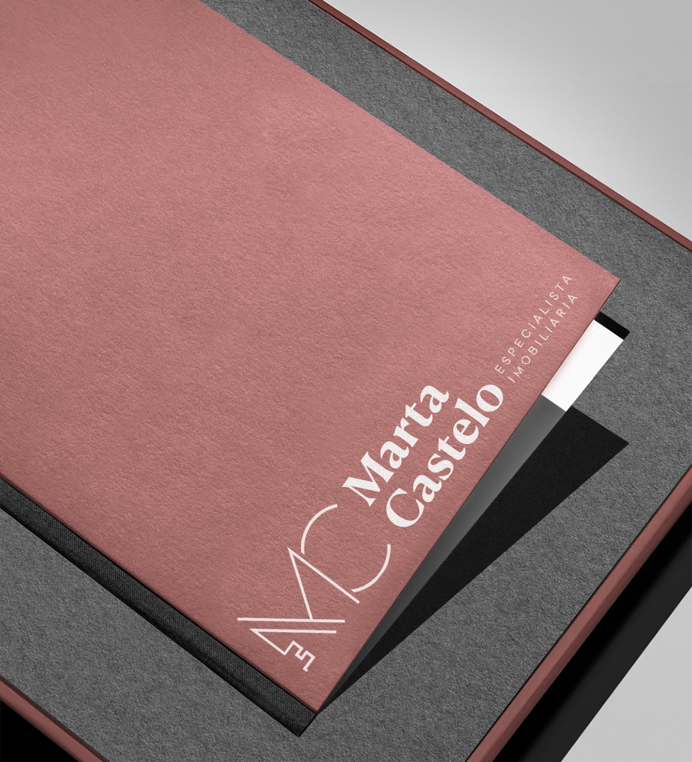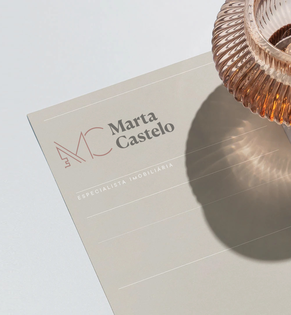 Design de identidade visual para Marta Castelo, especialista imobiliária. O projeto reflete a sua personalidade profissional — confiança, elegância e proximidade. Através de uma paleta sofisticada, tipografia moderna e um logótipo distintivo, reforça a sua presença no mercado imobiliário. Criação de logótipo, cartão pessoal e aplicações gráficas do economato, assegurando uma imagem coerente em todos os suportes.