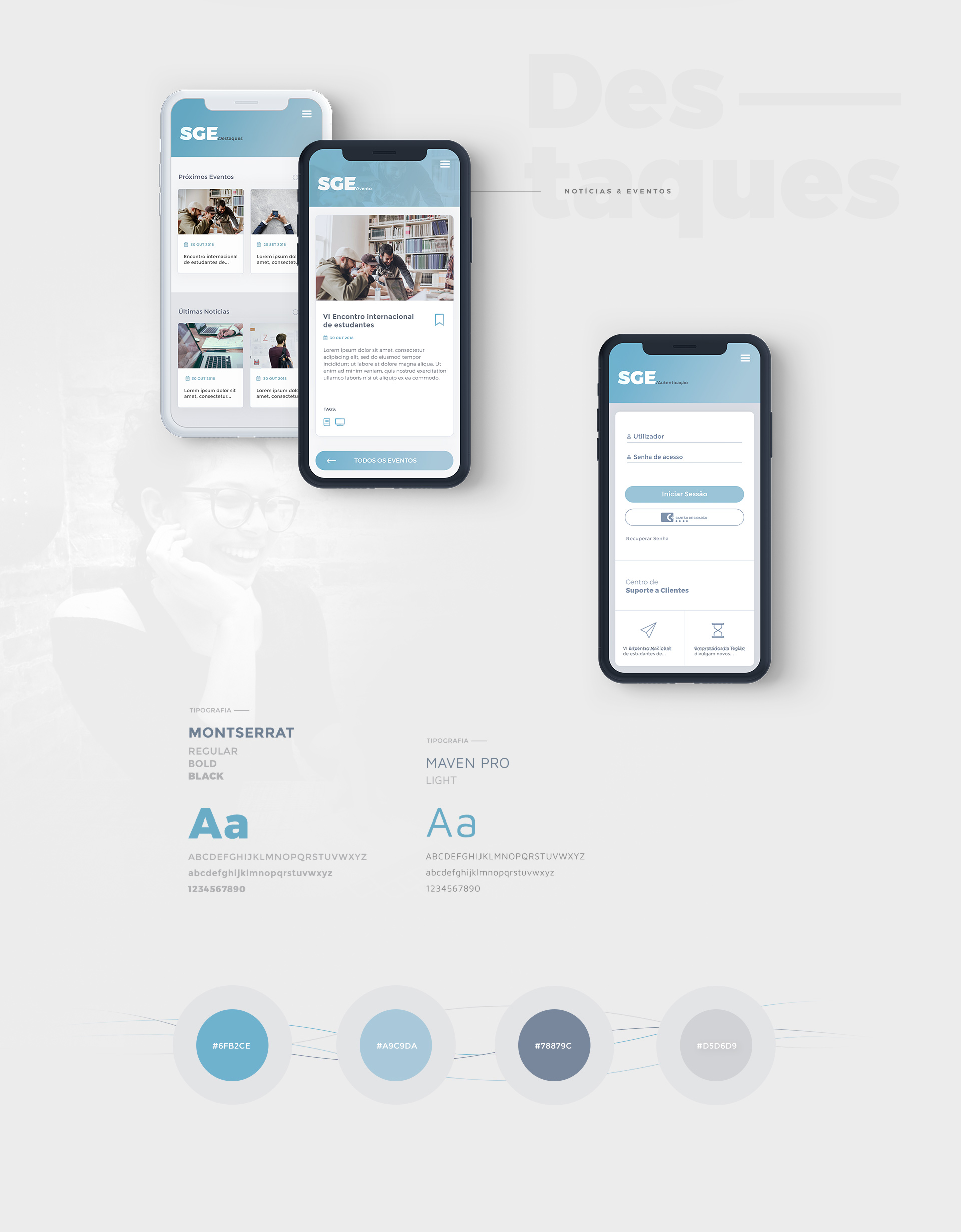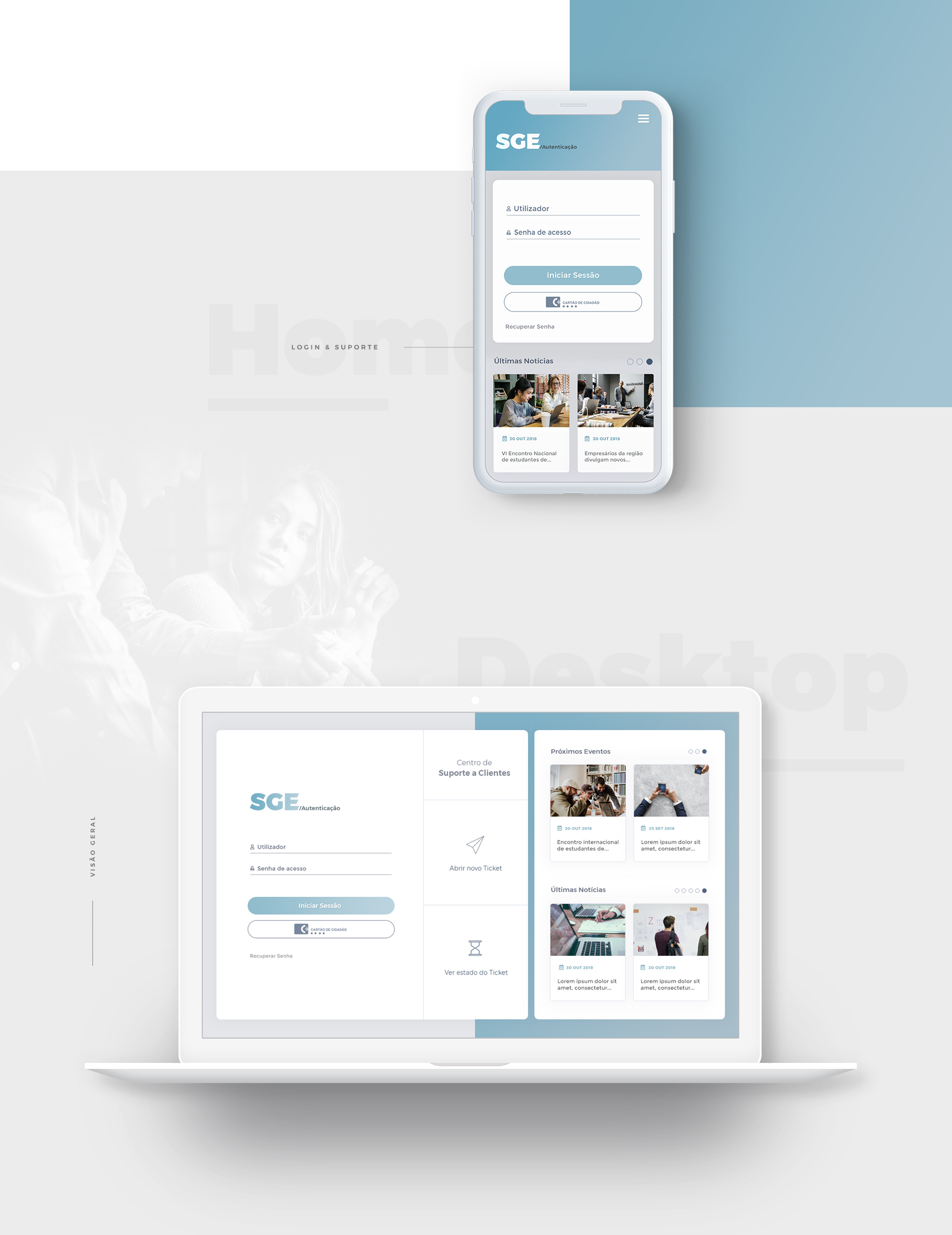 Design da interface principal de utilizador para o SGE – Sistema de Gestão Escolar, em versões Web e App mobile. Esta plataforma destina-se à consulta e partilha de dados entre Escolas e Municípios, bem como notícias e eventos dos mesmos.