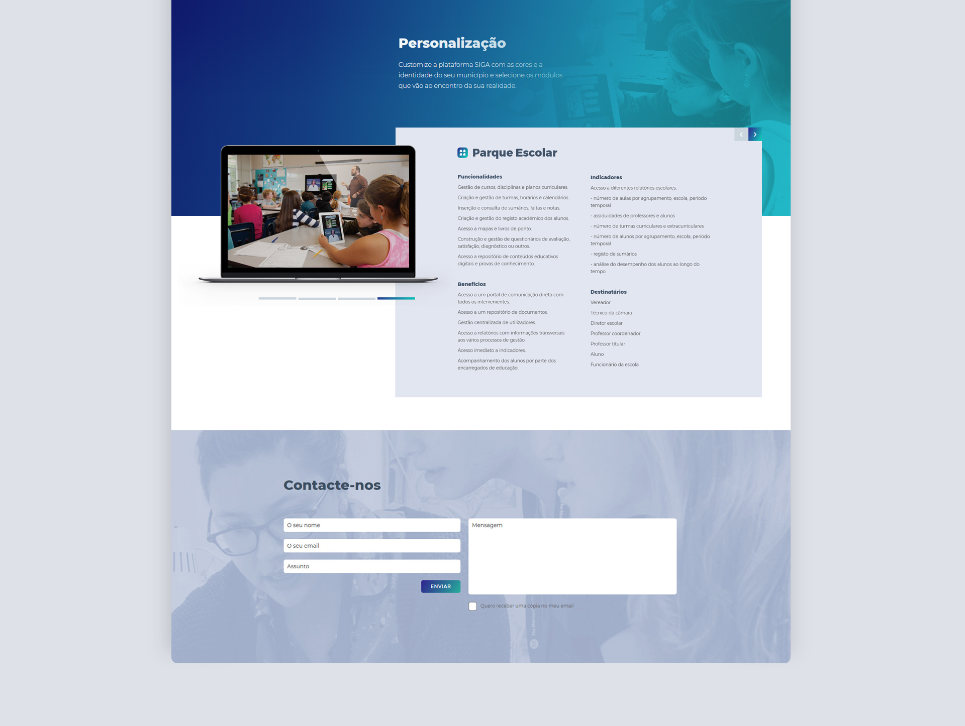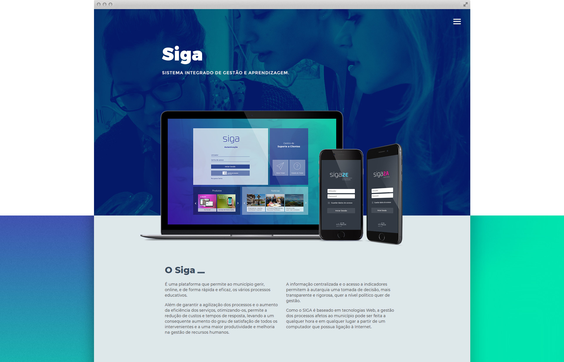 Re-design de todo o website e Landing Page da plataforma Siga, para a Edubox S.A. O Siga é um sistema modular e completamente personalizável que permite a Municípios e Escolas gerir, online e de forma rápida, os vários processos do quotidiano escolar.
