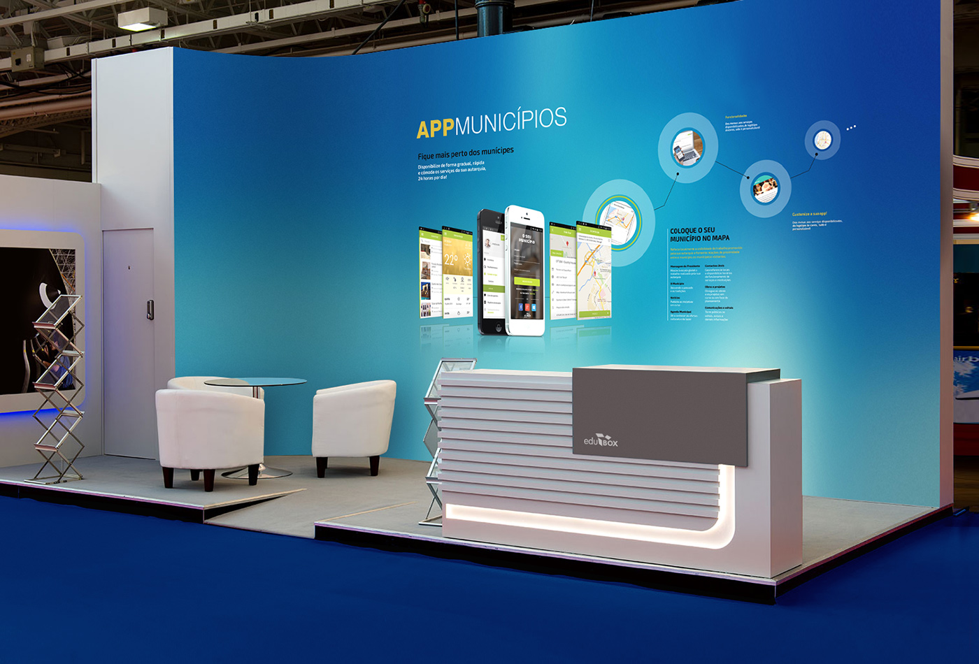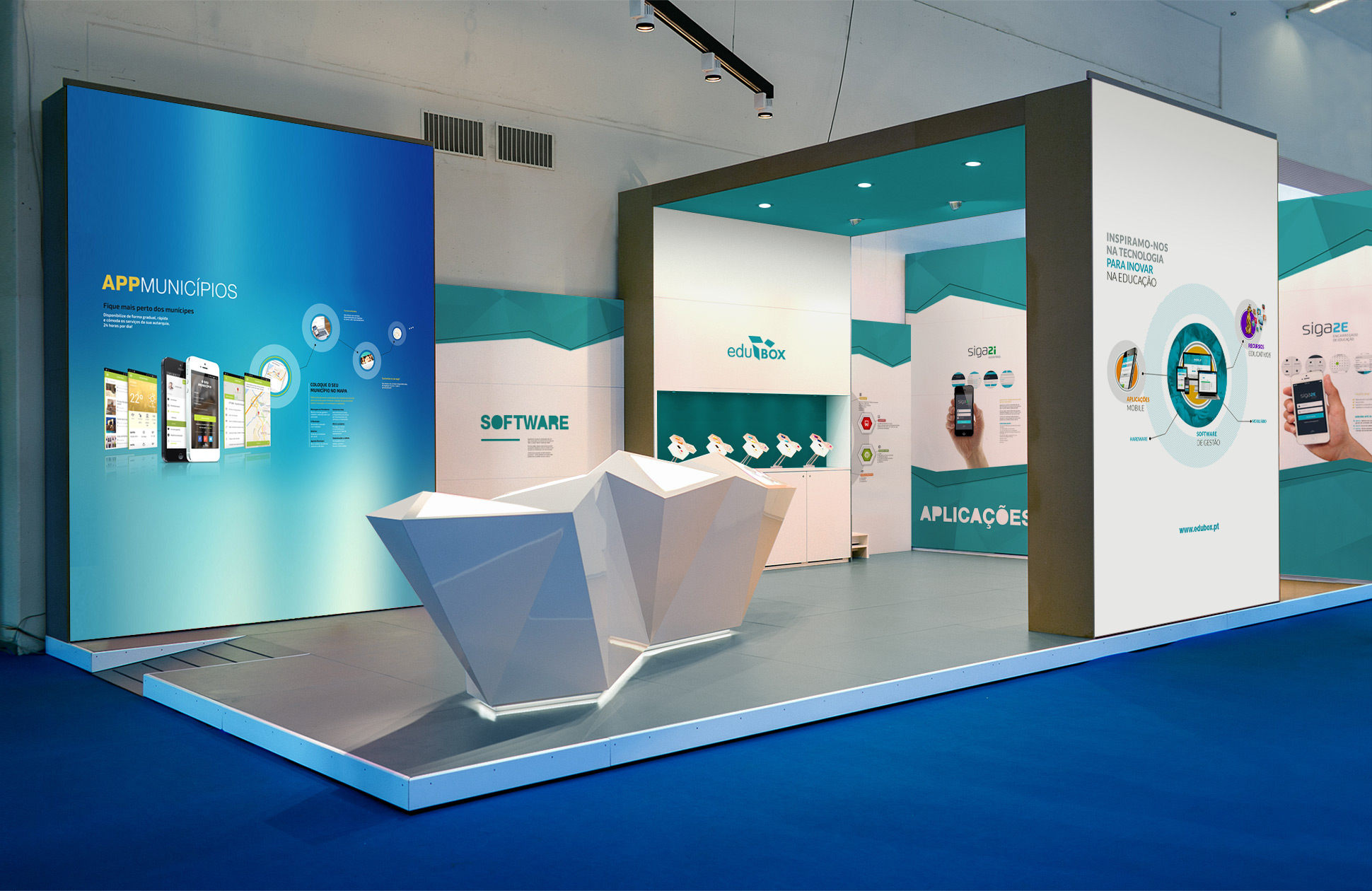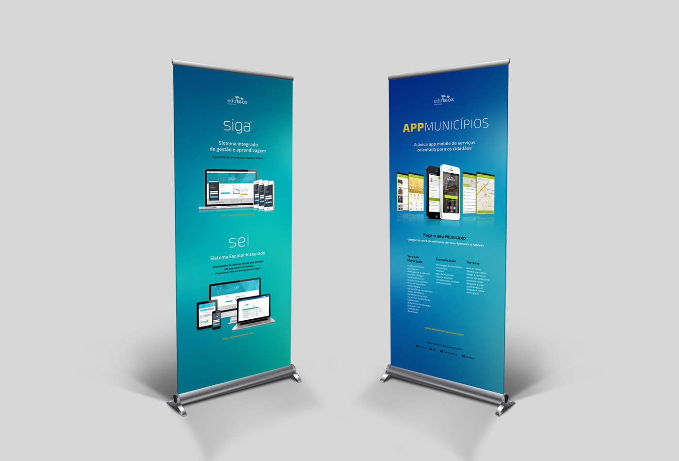Propostas de design para stands, módulos de comunicação, expositores e painéis para Edubox – Empresa que actua na área da Tecnologia para a Educação. Todos os materiais foram desenvolvidos para utilização em diversas feiras e eventos tecnológicos.
